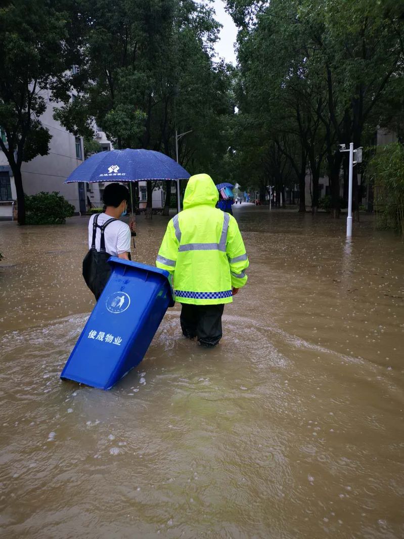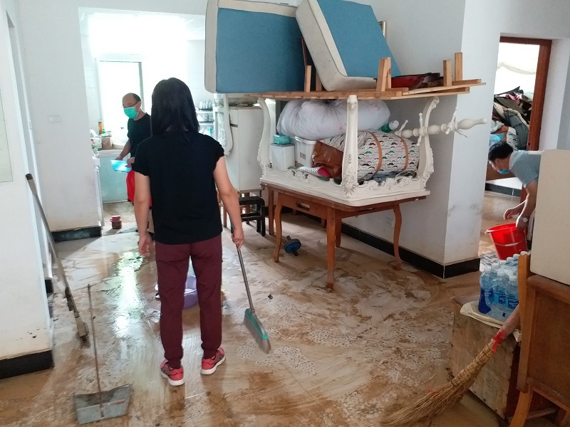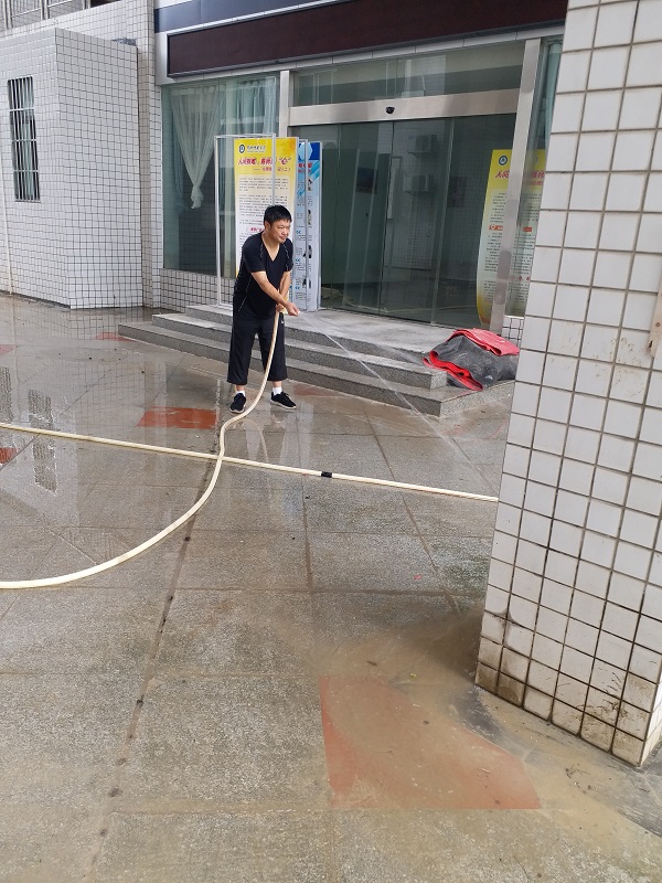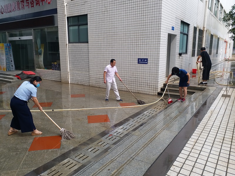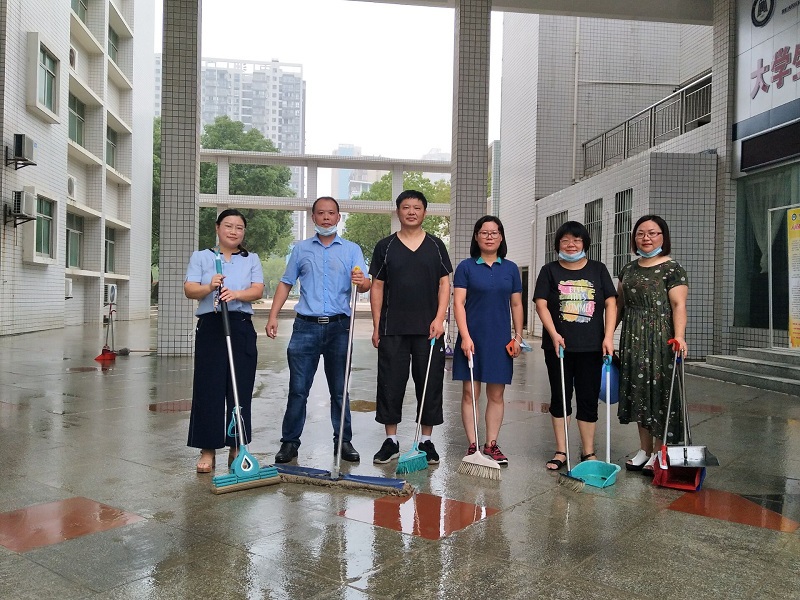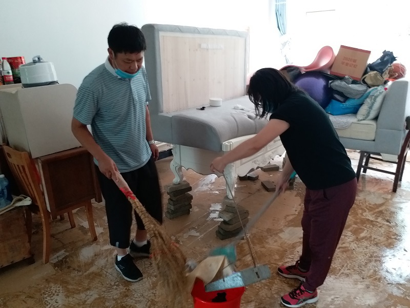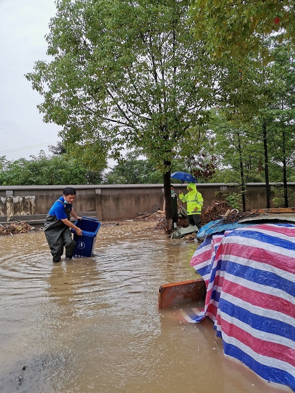 洪水灾情发生以后,公司党总支部第一时间做好应急处置、抢险救援等工作,为受灾教师遮风挡雨,带去了暖心和安心。7月7日,公司住在北校区兰园11栋一楼的裴艳丽博士家里被洪水围困,公司迅速成立了营救专班,班子全体成员及办公室成员,冒着瓢泼大雨,趟着齐腰深的洪水,把她及女儿安全转移出来,并将其家里的物品搬到安全的地方。7月8日,当得知校外陪读村租住教师陈松博士一家被洪水围困,导致无法出行时,公司领导专门冒雨送去下水衣等防灾物资,积极开展援助工作。在公司汛情基本得到控制之后,公司领导班子和老师们又积极投入到灾后自救的工作中。7月13日,公司组织了全体行政人员对院内所有办公室及楼面公共区域环境卫生进行了全面清扫和消杀工作。7月14日,公司组织力量又到裴艳丽老师家里,一起帮助其清理家里的淤泥和垃圾,打扫室内卫生,并仔细地进行室内清理和消毒,帮助她恢复正常的生活。7月16日上午,公司再次对致远楼一楼的周边区域、老员工活动中心周边进行了大清扫,清理洪水退去后的泥沙和垃圾,打扫周边环境卫生,使校园环境焕然一新。