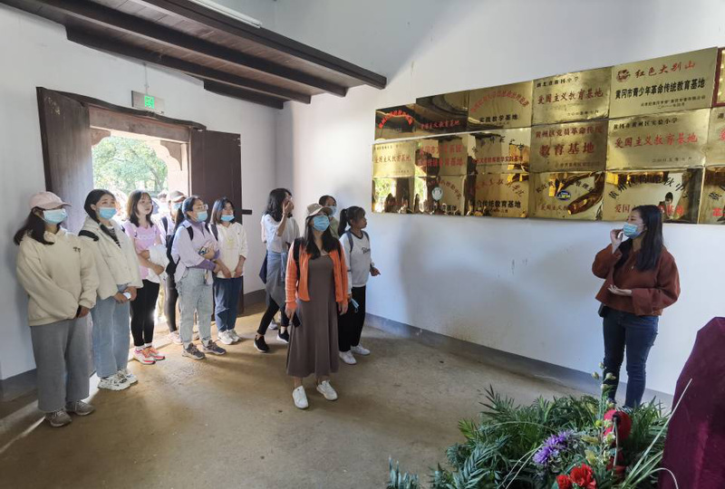 历经五小时的徒步行走,师生一行于中午12:00全部抵达陈潭秋故居所在地——陈策楼镇。简单休整后,一行人来到陈潭秋故居,细心倾听讲解员介绍陈潭秋烈士的生平事迹和革命壮举,参观陈潭秋故居陈列的烈士遗物和图片资料。在陈潭秋雕像前,马克思主义宣讲团成员、思政1901班王媛同学对陈潭秋同志在新疆地区工作并惨遭杀害的经过向同学们作了细致地讲解。