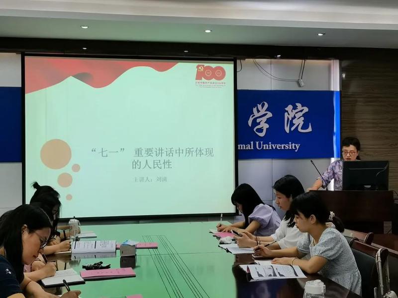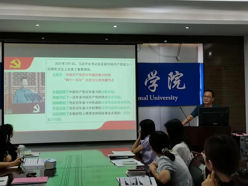 刘清老师和彭旺林老师在备课会上为青年宣讲团作“七一”重要讲话精神的导学和解读。刘清老师从“七一”重要讲话的背景、重要意义和内容基本框架三个方面阐述如何整体把握“七一”重要讲话精神,尤其着重强调了“七一”重要讲话中的人民性。刘老师提出习总书记的讲话中“人民”一词出现了八十多次,人民至上、以人民为中心的理论贯穿全篇。百年党史就是马克思主义人民群众观和党的初心使命的伟大践行的历史。人民群众观是马克思主义的重要内容,中国共产党是马克思主义旗帜下的中国工人阶级、中国人民、中华民族的先锋队,党的初心和使命就是为中国人民谋幸福,为中华民族谋复兴。