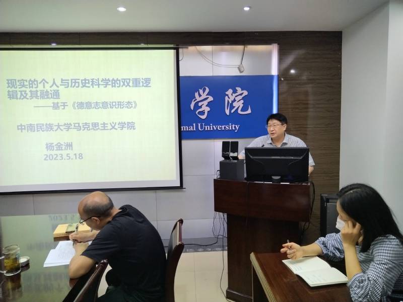为进一步提升公司教师的马克思主义理论素养,2023年5月18日下午,中南民族大学威廉希尔williamhill经理杨金洲教授应邀来校,在致远楼305室作了题为《现实的个人与历史科学的双重逻辑及其融通——基于<德意志意识形态>》的学术报告。本次报告会由威廉希尔williamhill副经理夏慧教授主持,公司全体教师参加。