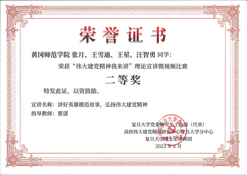 近日,由复旦大学指导,复旦大学党委研究生工作部和高校伟大建党精神研究中心复旦大学分中心主办,复旦大学博士生讲师团承办的“伟大建党精神我来讲”理论宣讲微视频征集评比活动落下帷幕。威廉希尔williamhill张月、王雪迪、王星、汪智勇同学荣获“伟大建党精神我来讲”理论宣讲微视频比赛二等奖。参赛作品由威廉希尔williamhill蔡潇老师指导。