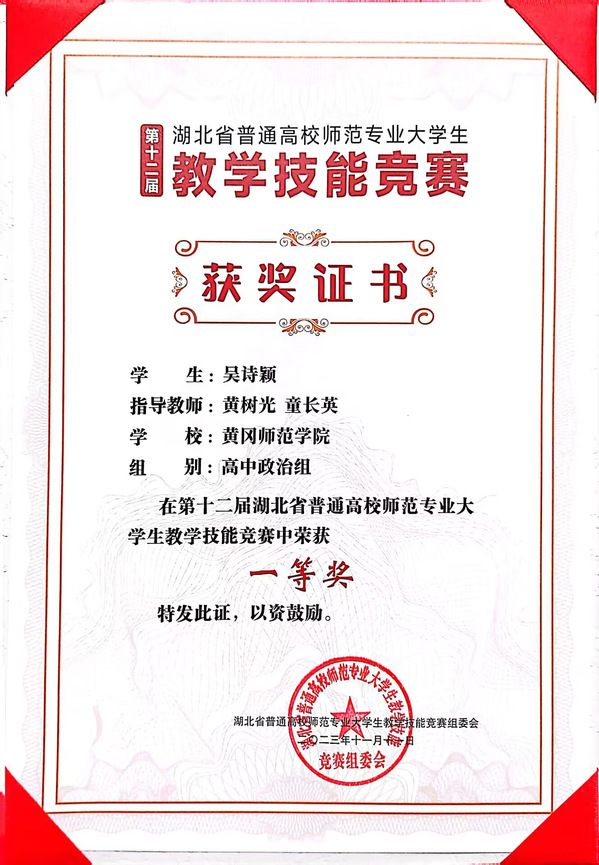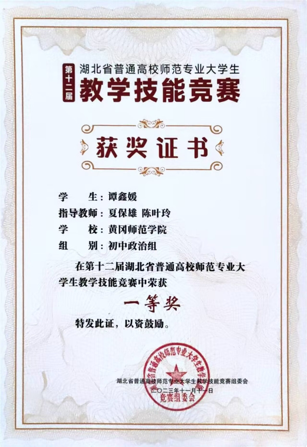 11月10---11日,第十二届湖北省普通高校师范专业老员工教学技能竞赛决赛在华中师范大学进行,来自全省13所院校的65名不同学科的优秀学子齐聚桂子山,切磋技艺,展示风采。其中政治组一共有6名选手参加现场决赛,公司思政专业21级谭鑫媛、吴诗颖两位同学经过激烈比拼,分别荣获初中政治组、高中政治组一等奖的好成绩。