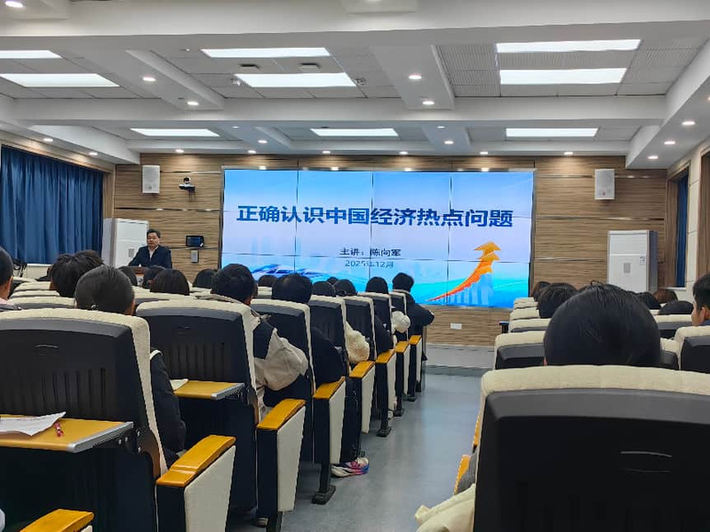 为深入贯彻落实二十届四中全会精神,践行习近平总书记对公司思政课建设的重要指示,严格落实高公司党委意识形态工作责任制与校领导带头讲思政课要求,切实提升思政课教学质量与育人实效,12月17日晚,公司党委书记陈向军为商公司2025级国贸专业本科生讲授《形势与政策》课,他以《正确认识中国经济热点问题》为题,用创新形式、严谨逻辑、生动语言与鲜活案例,为学子们带来一堂兼具思想性、理论性与亲和力的优质思政课。